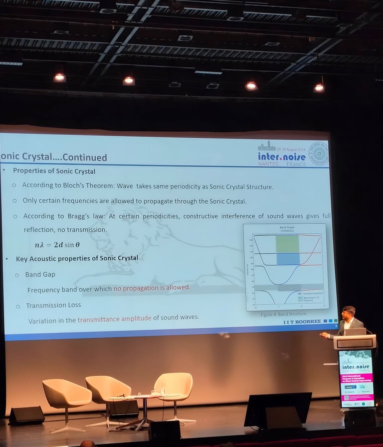 This research was presented at the prestigious Internoise 2024 conference, where it explored how the shape, opening angle, and periodicity of scatterers in sonic crystals impact sound attenuation. The study investigates innovative designs in local resonating sonic crystals to enhance noise control in various applications, including transportation and urban noise mitigation.